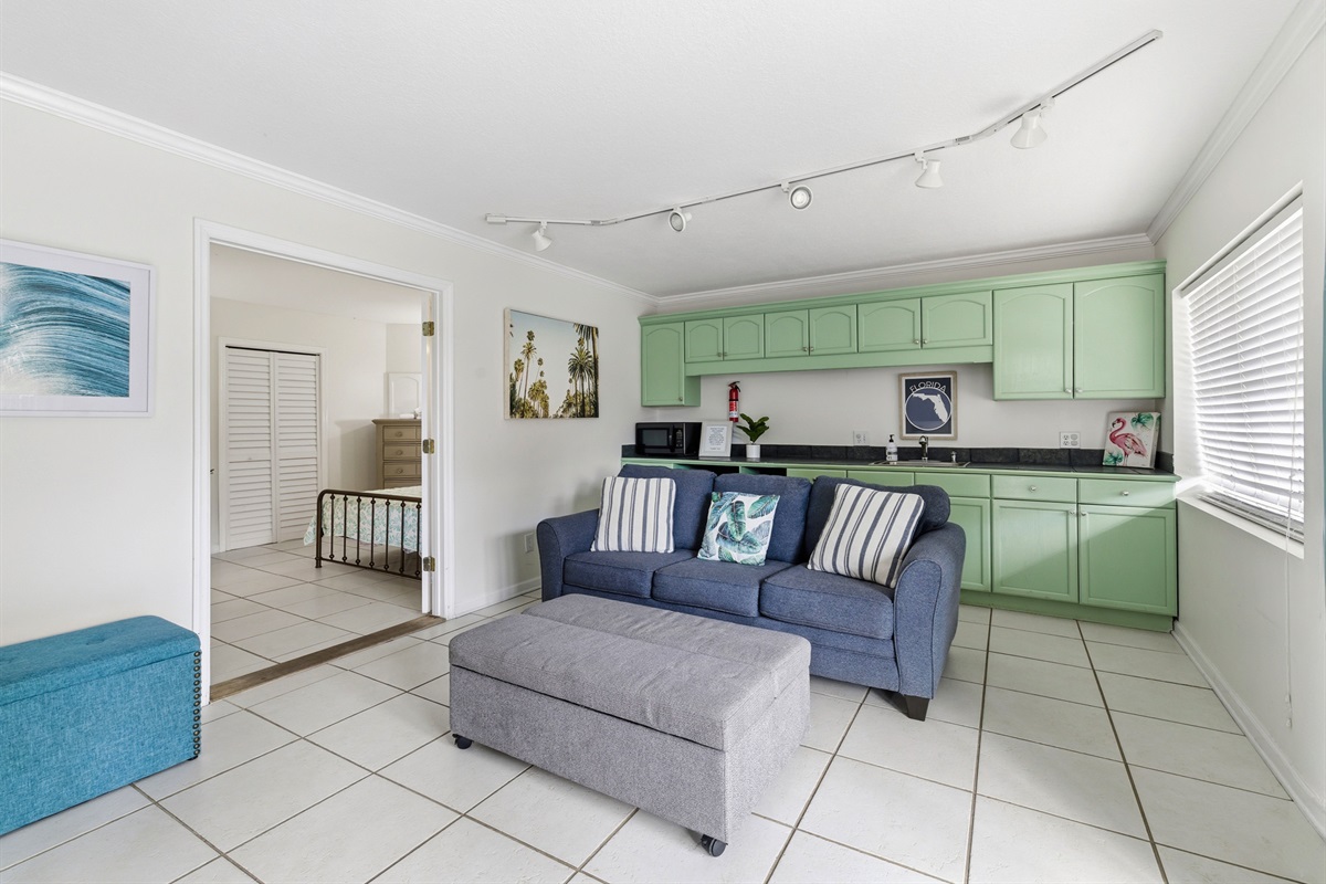 With a separate entrance, this home is perfect for multiple families. The ground level is the 1st master queen bed, 1 bath, and a living room with a kitchenette (fridge, sink, microwave), the living space has a 65 inch TV that is wall mounted and can be titled out facing the pool area. The space also has a sliding glass door and large window facing the pool. A queen bed located in the bedroom, the living room has a pull out queen sofa sleeper and an ottoman that converts into a twin bed.